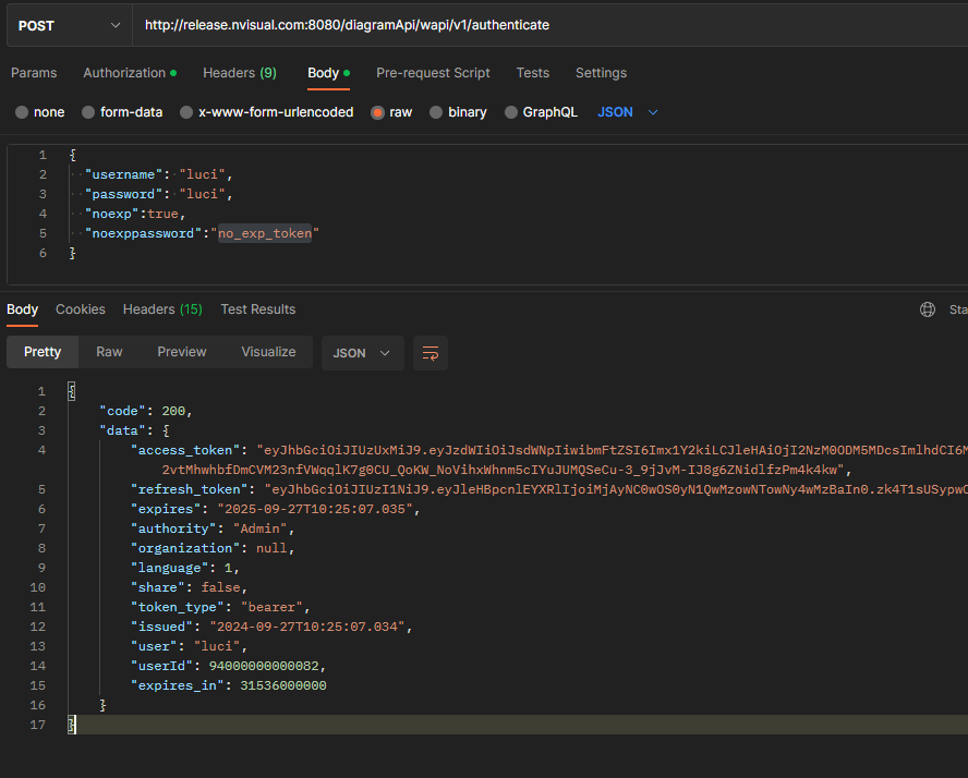 接口描述:传入用户名、密码进行登录验证,验证通过则返回token令牌,nvisual内登录时会调用此接口来获取token,nvisual内几乎每个接口都需要使用此接口生成的令牌做Authorization的Bearer Token验证。