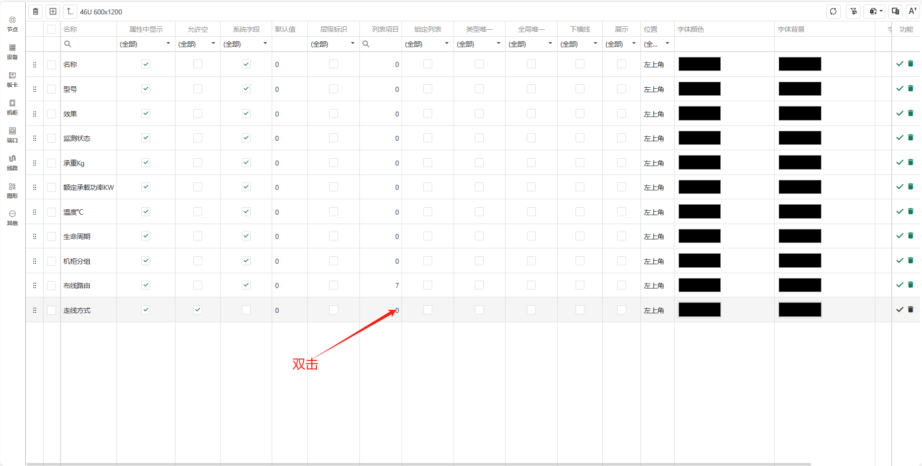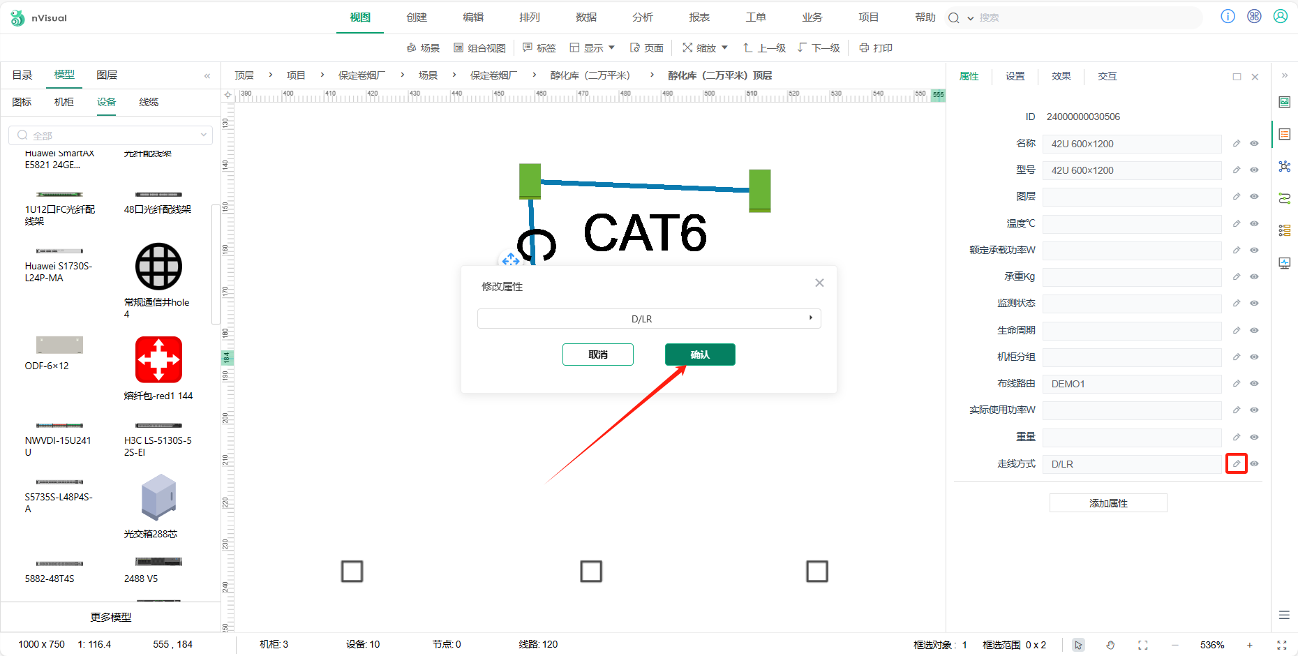 选择右上角模型库,按照型号名称找到该机柜,添加布线路由的值。