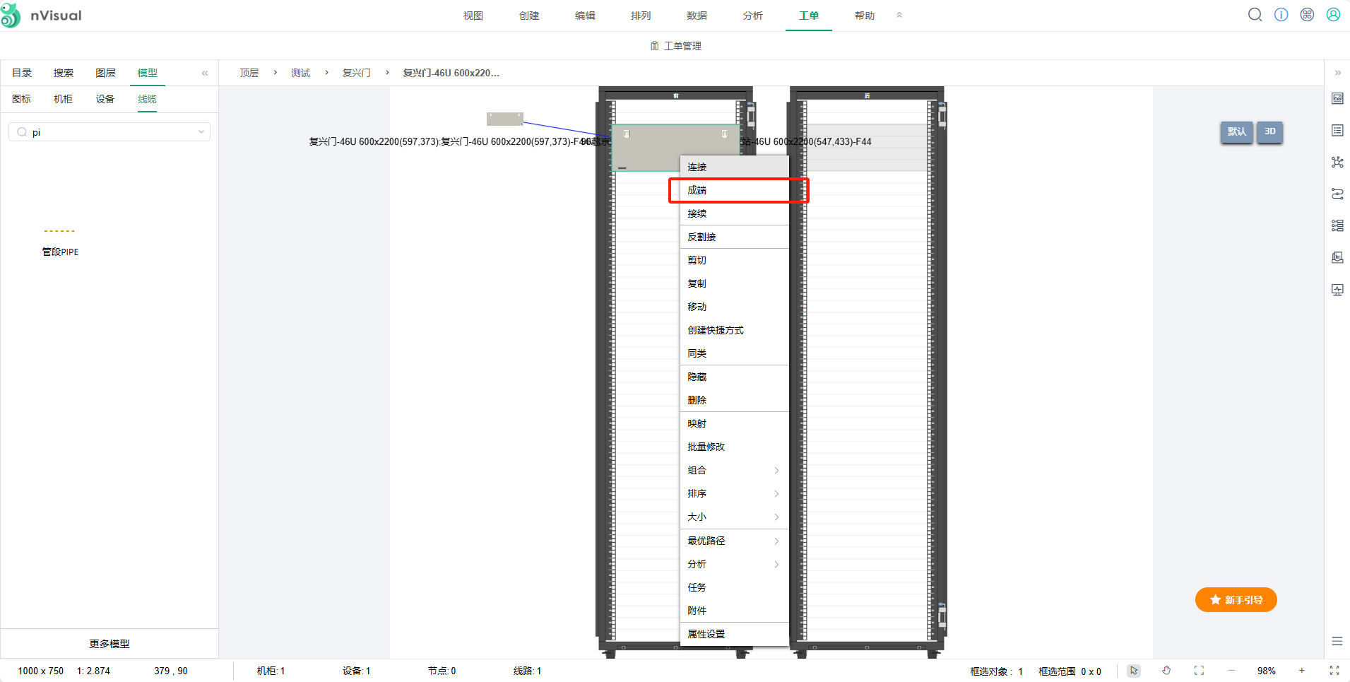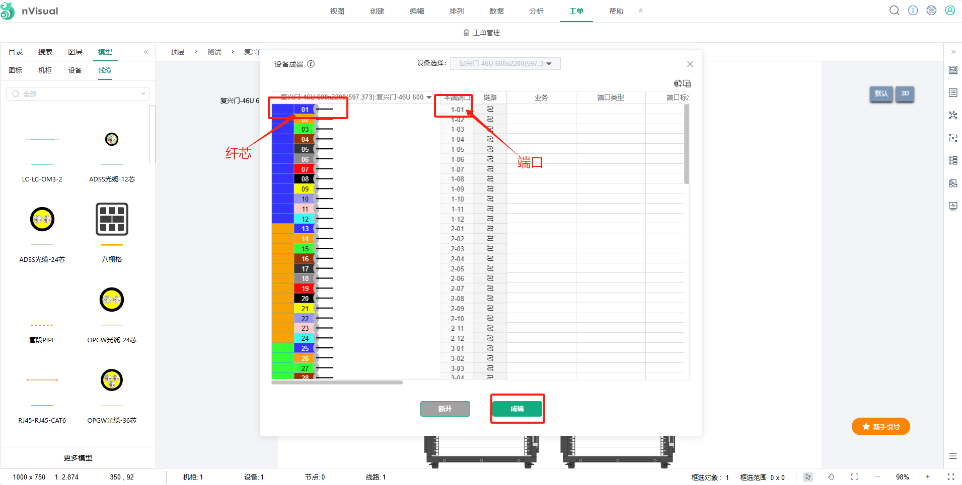 选中光纤配线架右键点击-----成端(本端和对端设备都需成端)