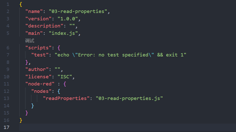 该文件为一个节点的配置文件,除了通常的条目外,该package.json文件还必须包含一个node-red 条目,该条目列出了.js包含要加载的运行时节点的文件。