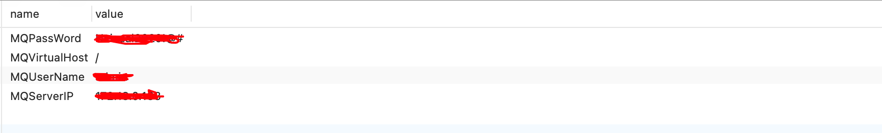 select name,value from global_settings where name in('MQServerIP','MQVirtualHost','MQUserName','MQPassWord','MQExchange');