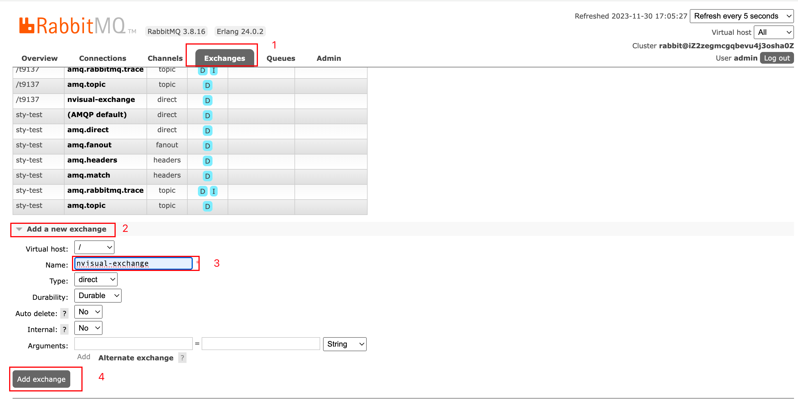 MQExchange为nVisual消息使用默认消息交换机,一般部署rabbitmq时创建,如果rabbitmq没有消息队列时,需要登录rabbitmq客户端页面进行添加“nvisual-exchange”交换机。