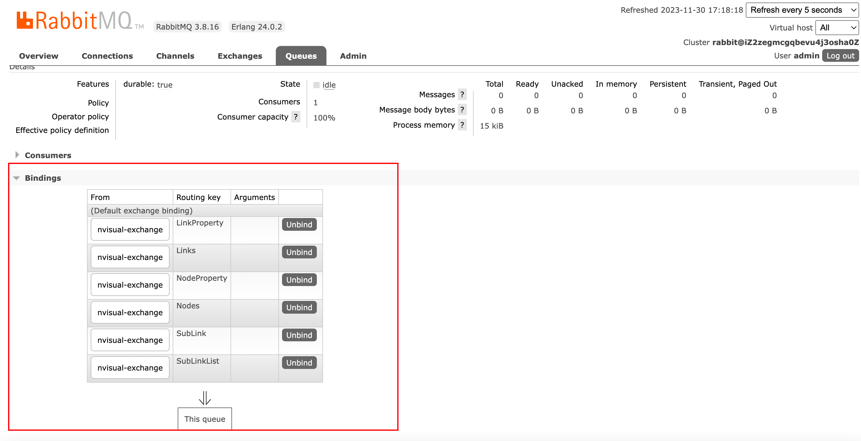 查看自定义队列与交换机绑定情况,成功绑定下即可接收nVisual消息。
