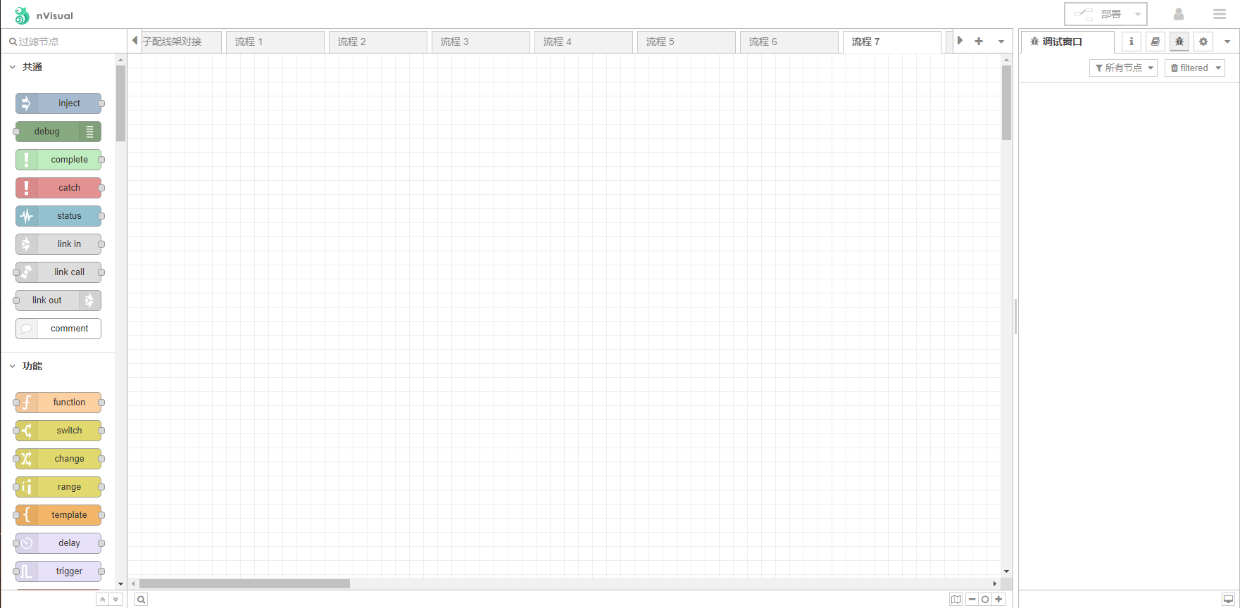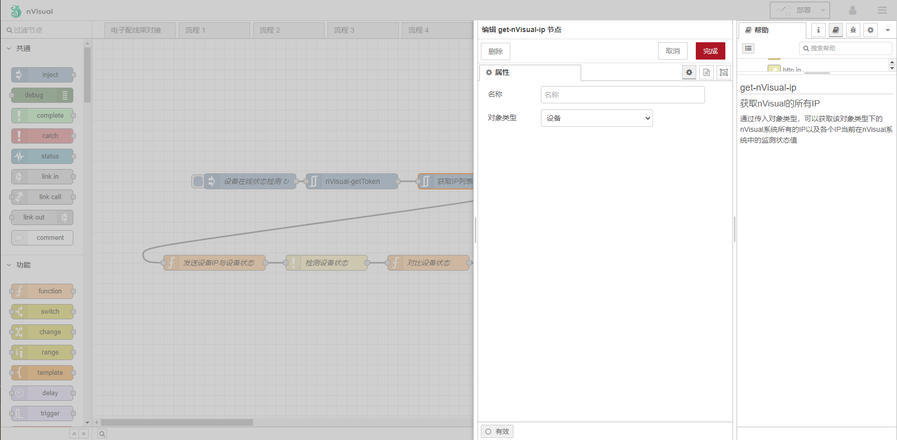 通过以上步骤,我们便可以实现通过node_red来实时采集nvisual设备在线状态数据。在node-red中,每一个节点都有着非常详细的使用介绍,主要是了解每个节点的用途以及接收和发送数据的传参变量名称。下面来介绍一下关于nVisual系统的节点使用: