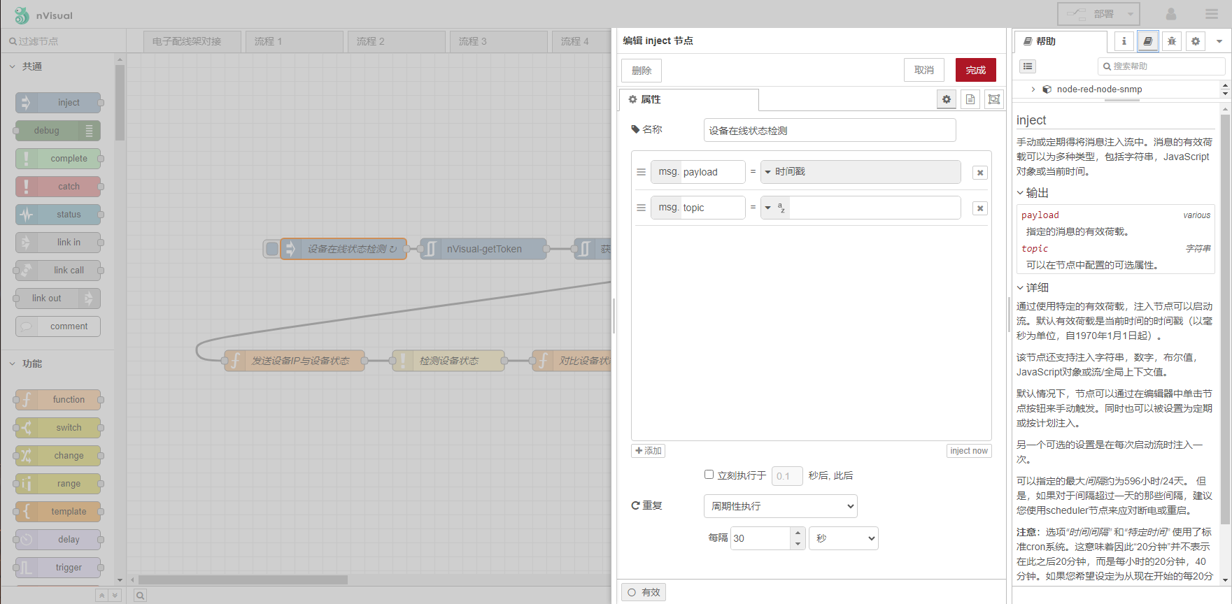 下面根据功能的分解来具体实现,首先通过inject节点来设置每隔30秒来监测一下设备状态,此时间间隔可以自行设置。双击inject节点,进入设置界面(所有节点都是通过双击节点的形式进入设置界面),可设置周期性执行以及时间间隔。