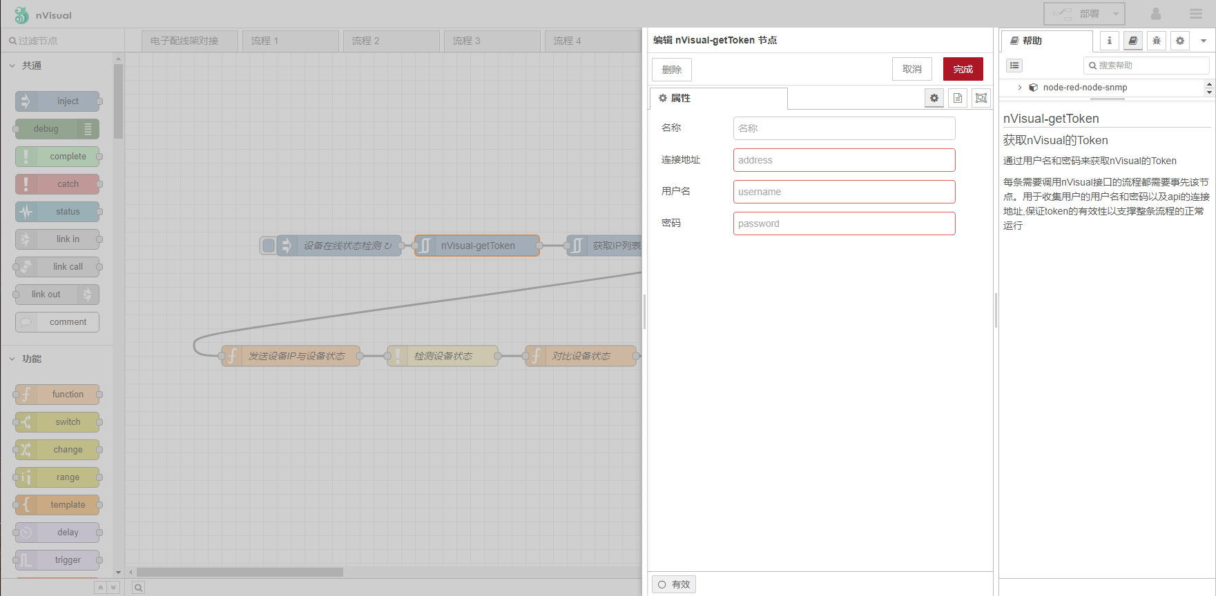 之后在获取nVisual设备ip列表之前,需要通过nVisual-getToken节点来登录用户名密码来登录。在nVisual-getToken节点中,打开设置界面,设置连接地址以及用户名、密码,点击完成即可登录成功。