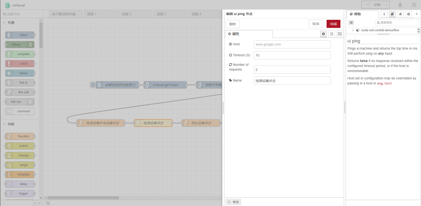 随后我们遍历从get-nVisual-ip节点返回的数组,将每一个IP通过ui ping节点以ping的方式监测设备是否在线,通过ui ping的使用文档我们的值,需要传入ip的遍变量为msg.host