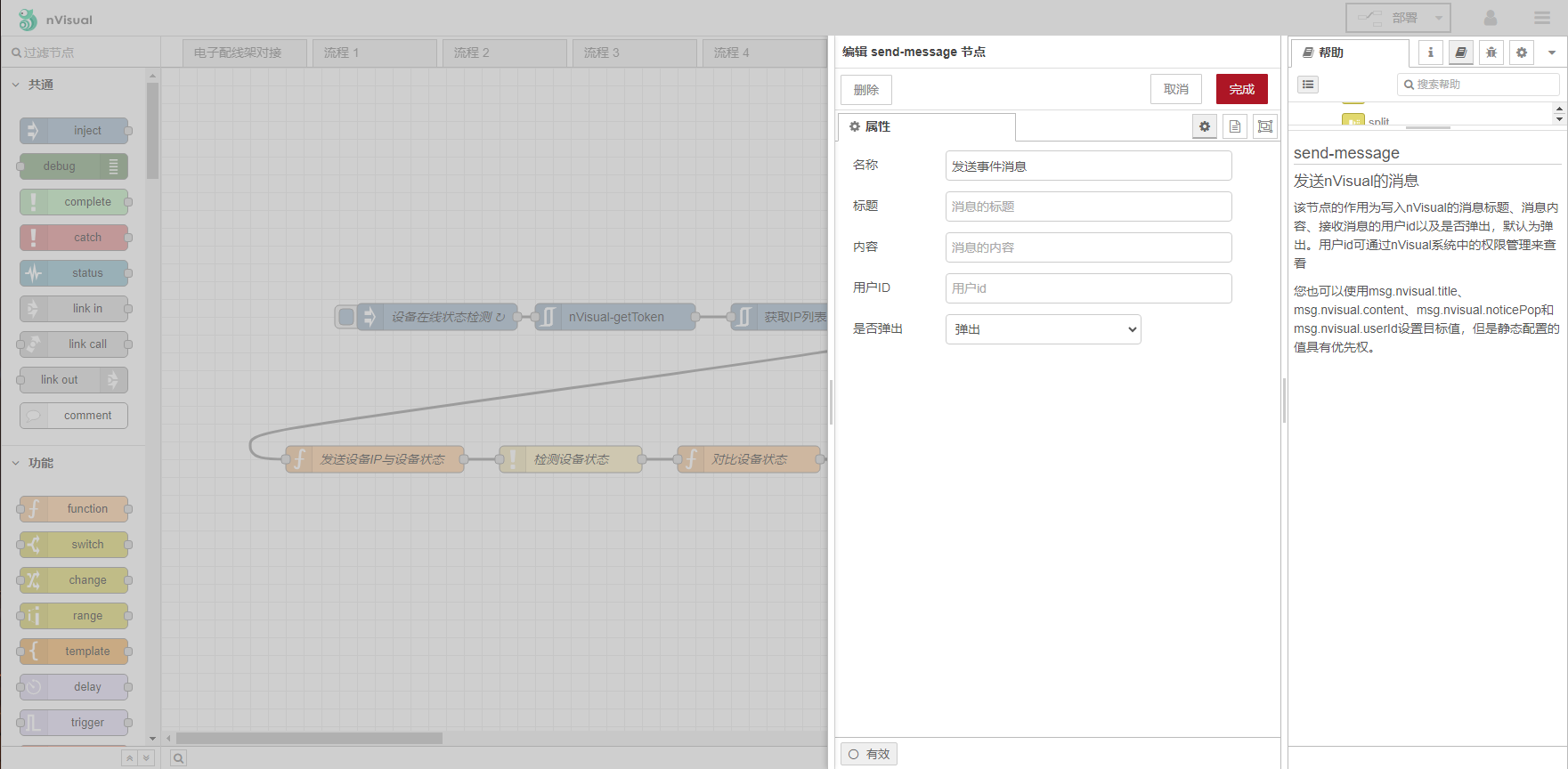 另外可以通过和send-message节点来发送通知信息。通过查看使用文档,我们可以看到,可以使用msg.nvisual.title、msg.nvisual.content、msg.nvisual.noticePop和msg.nvisual.userId设置目标值。这里需要注意的是nvisual系统管理员权限的用户能收到所有的消息,普通权限的用户只能收到关于自己的消息。