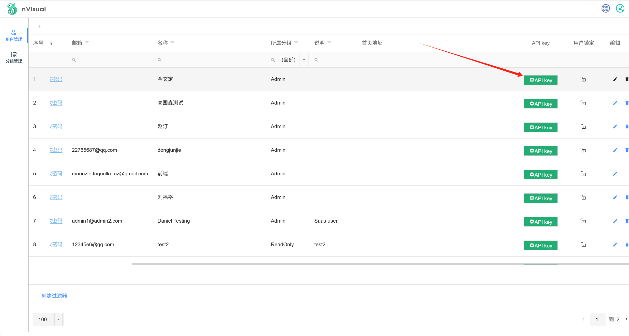 2.1、获取nVisual API key:登录nVisual——进入用户权限管理——API key——生成key.