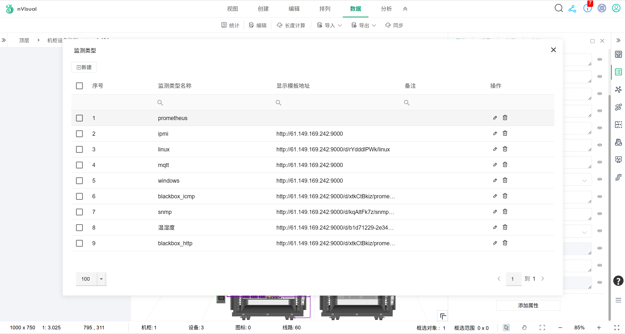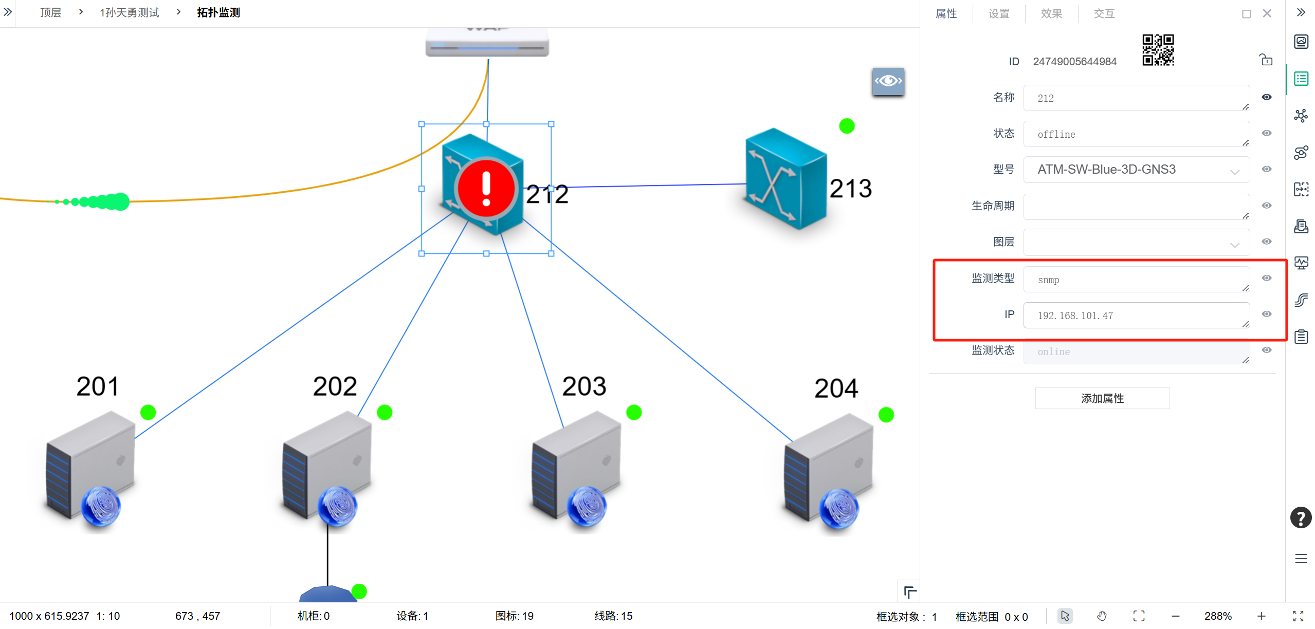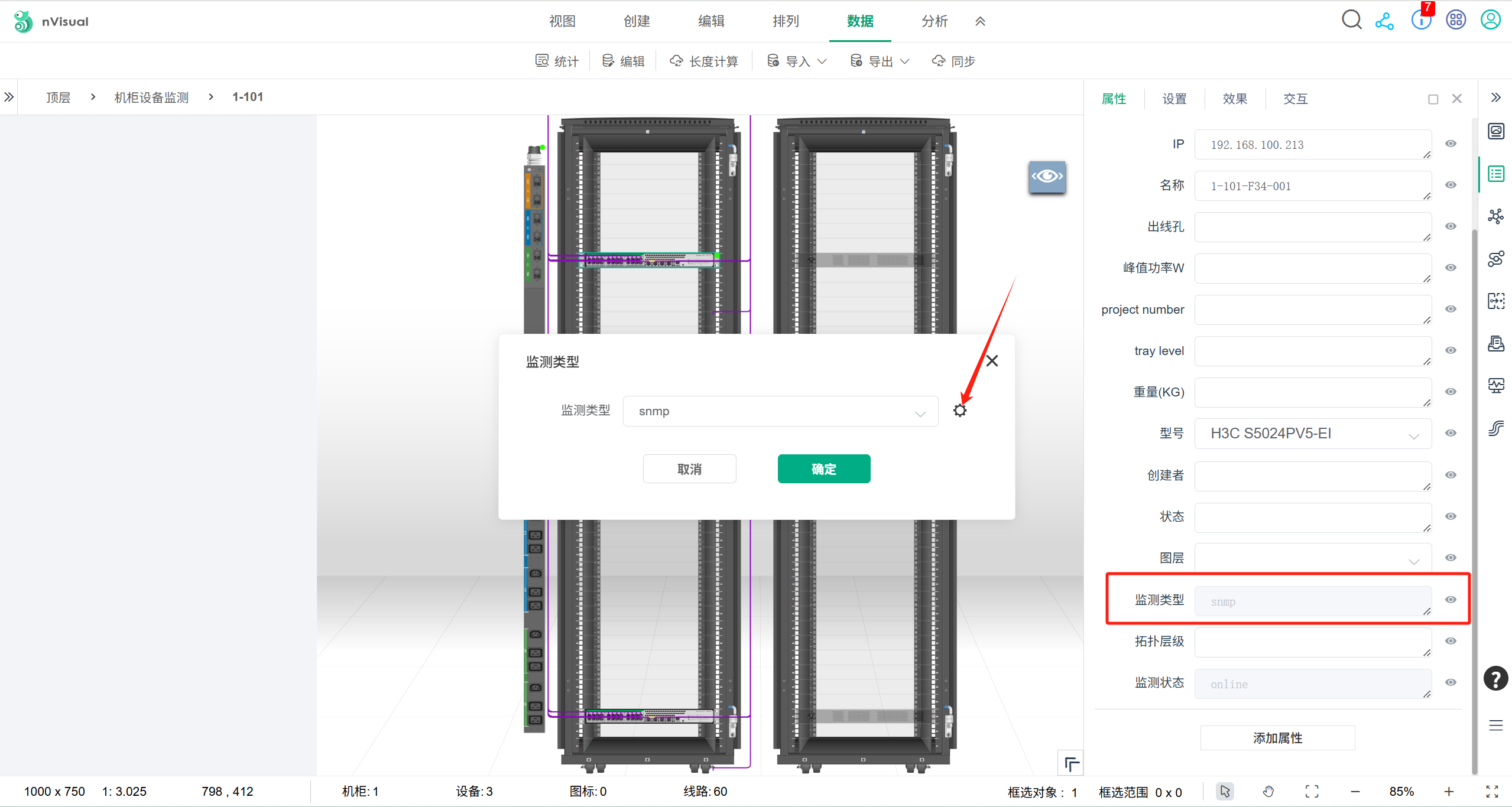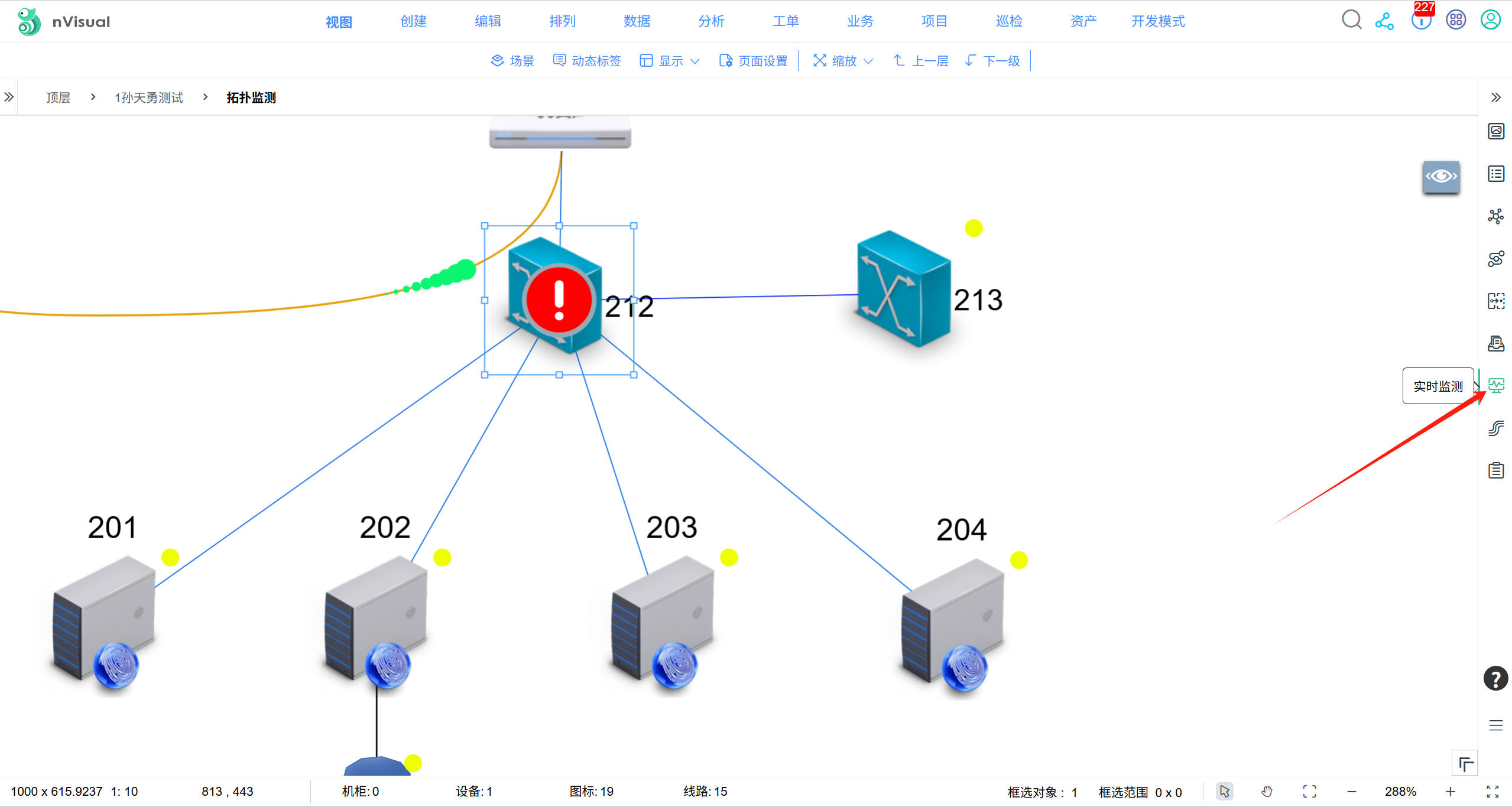 登录nVisual,在项目视图上创建对象图标,然后选择对象监测类型、IP,待1分钟后对象即进入监测状态: