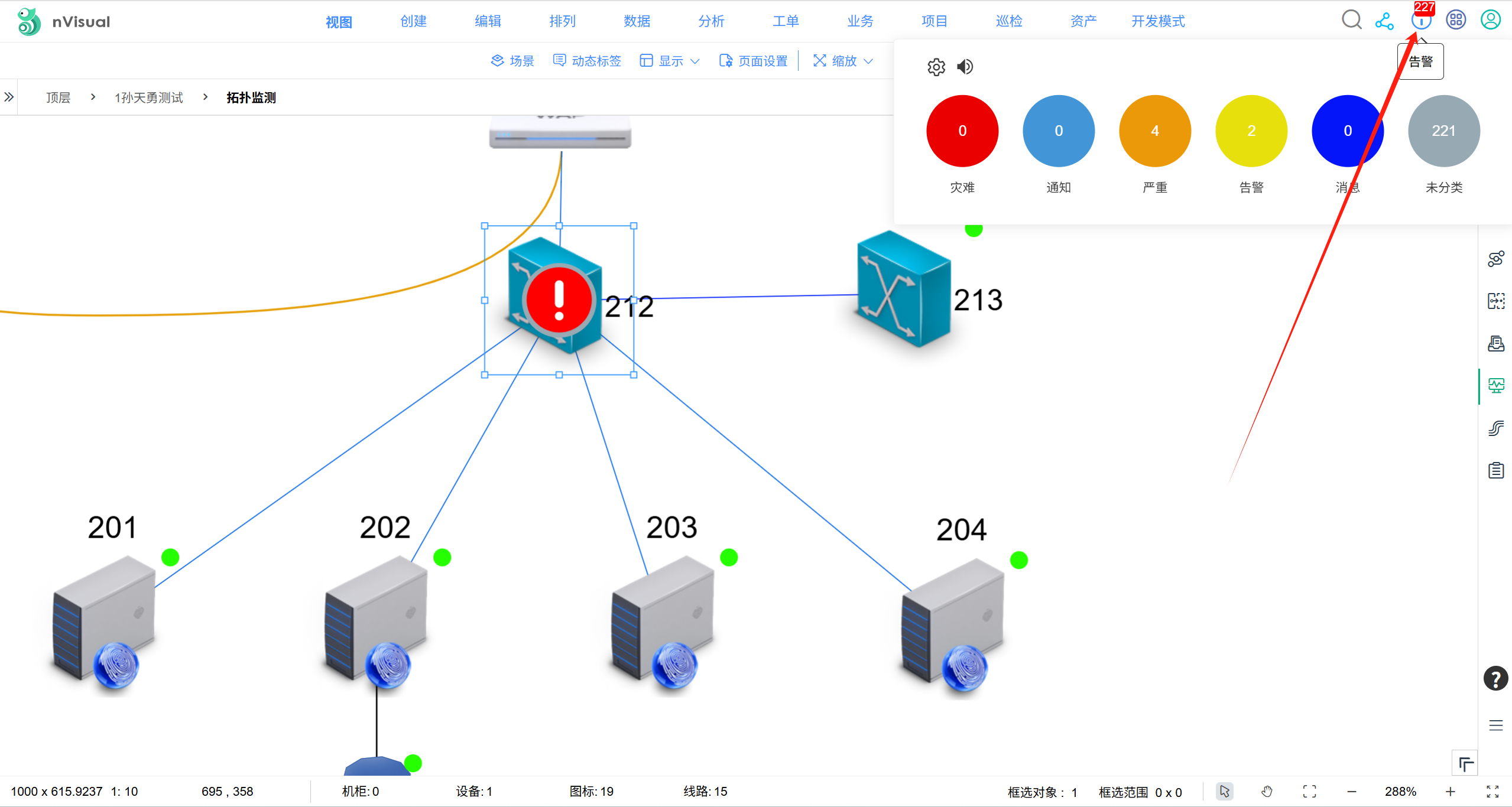对象图标上会显示对象当前在线状态(online/offline)、告警状态。