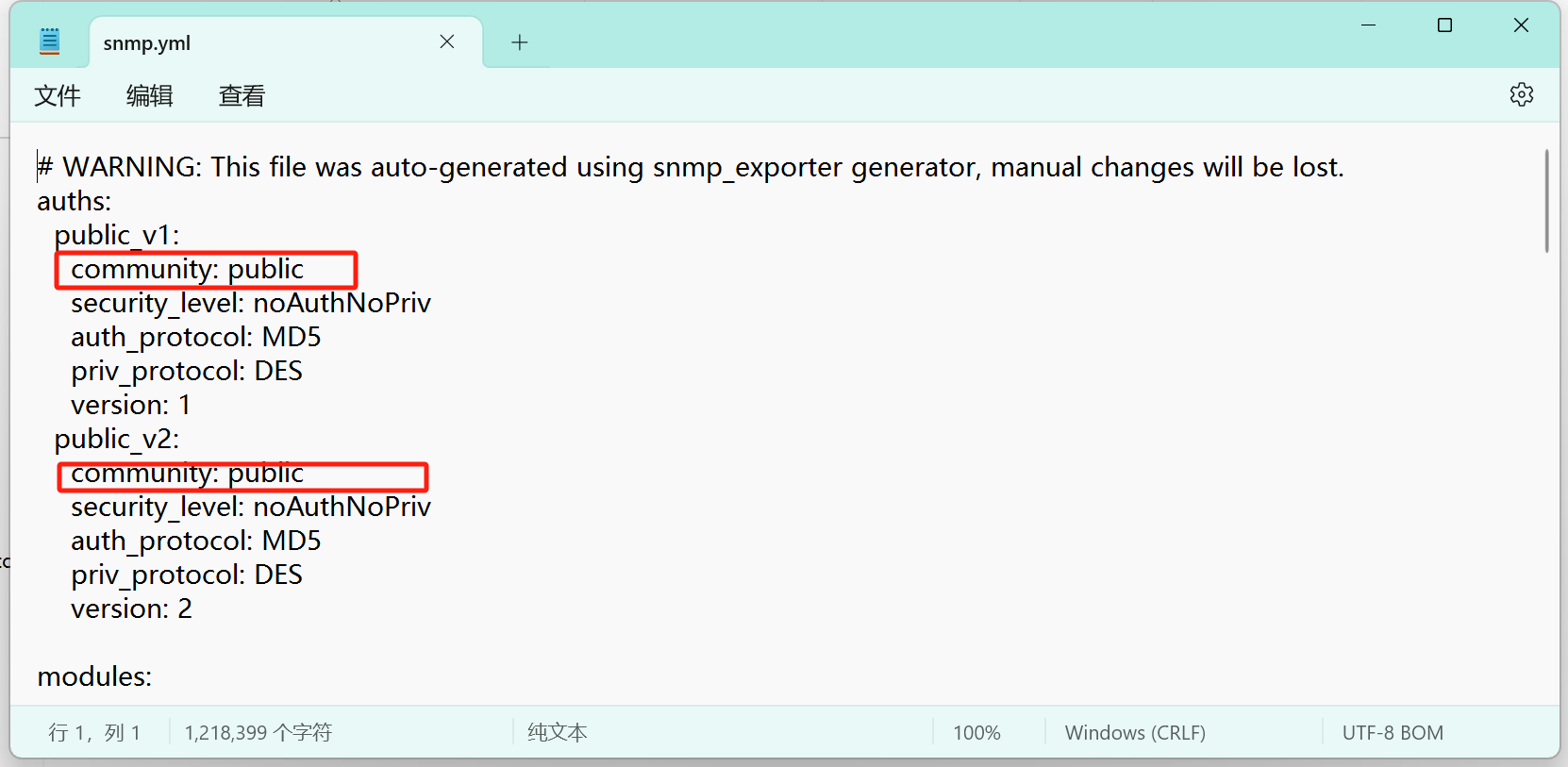 snmp监测采集community默认是“public",如与实际不致,请修改exporter/snmp.yml配置文件的community的值。