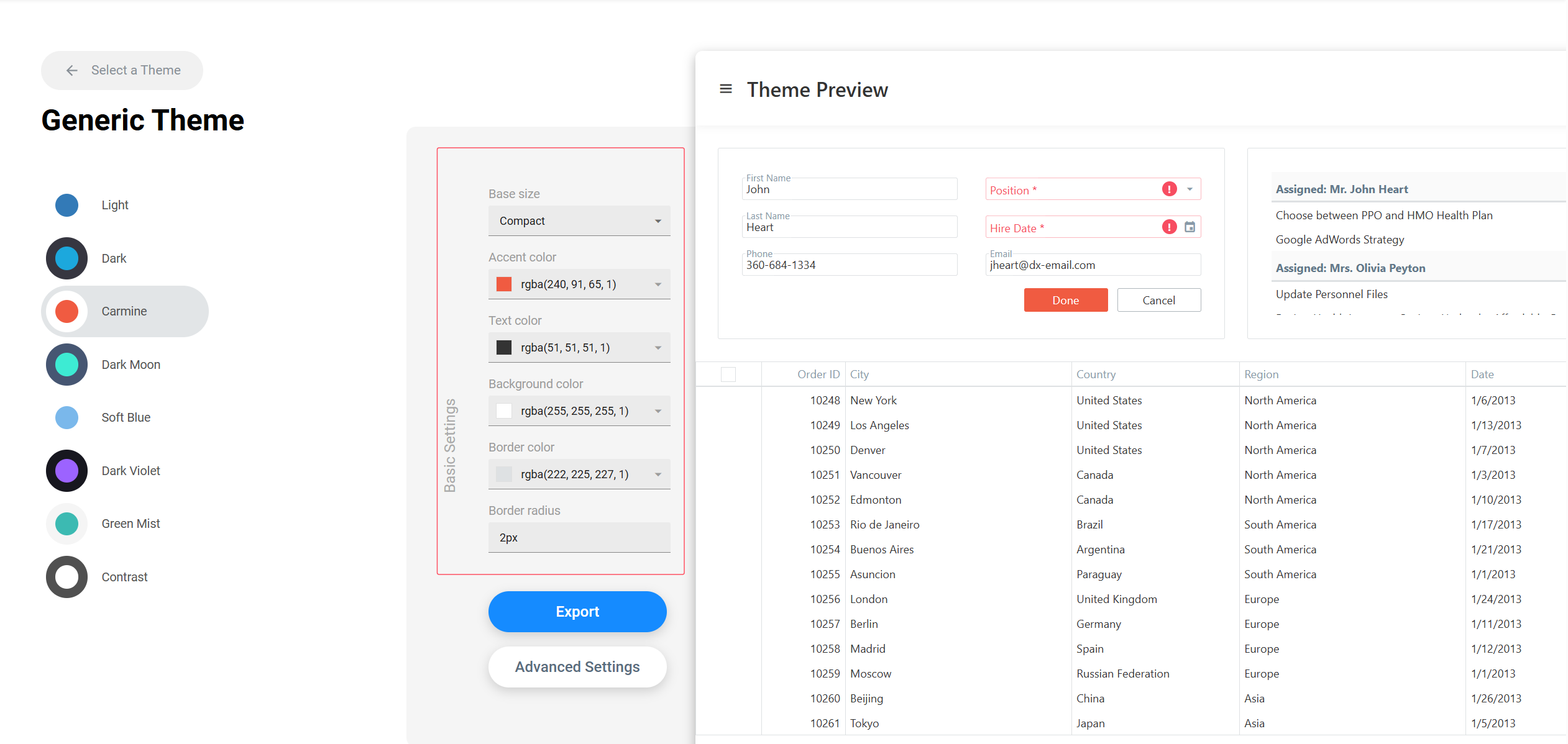 dev自带有8种主题可供选择。如果觉得这8种不满足需求,可以修改以下部分来对主题的构成进行调整,在nvisual系统中,我们的Base size设置的是compact,表示紧凑型,所以如果是在nvisual系统中应用,记都修改这个选项。其他的选项分别代表强调色、文本颜色、背景颜色、边框颜色、边框半径,都可以进行调整。如果还不满意,可以选择Advanced Settings,他表示高级设置,里面还有一些更细致的调整,这里不多做讲解,有兴趣的可以自己尝试。
