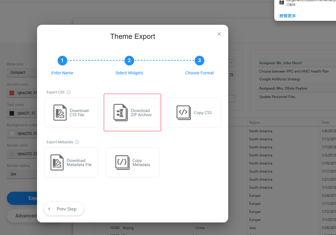 敲定好主题细节以后,可以选择导出,点击Export,选择Download ZIP Archive,将css文件下载到本地即可完成第一步。如下所示: