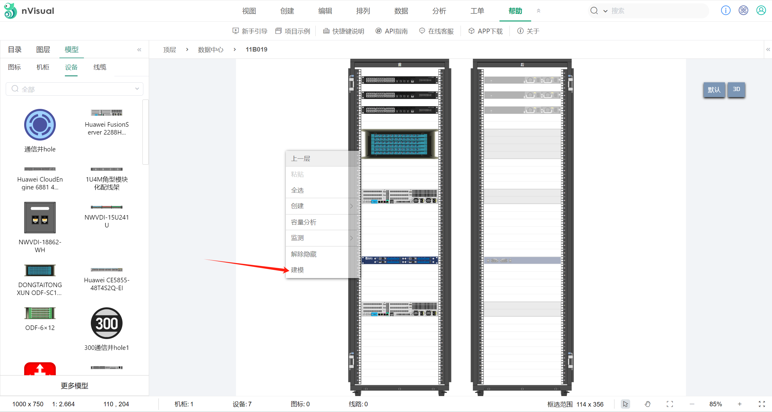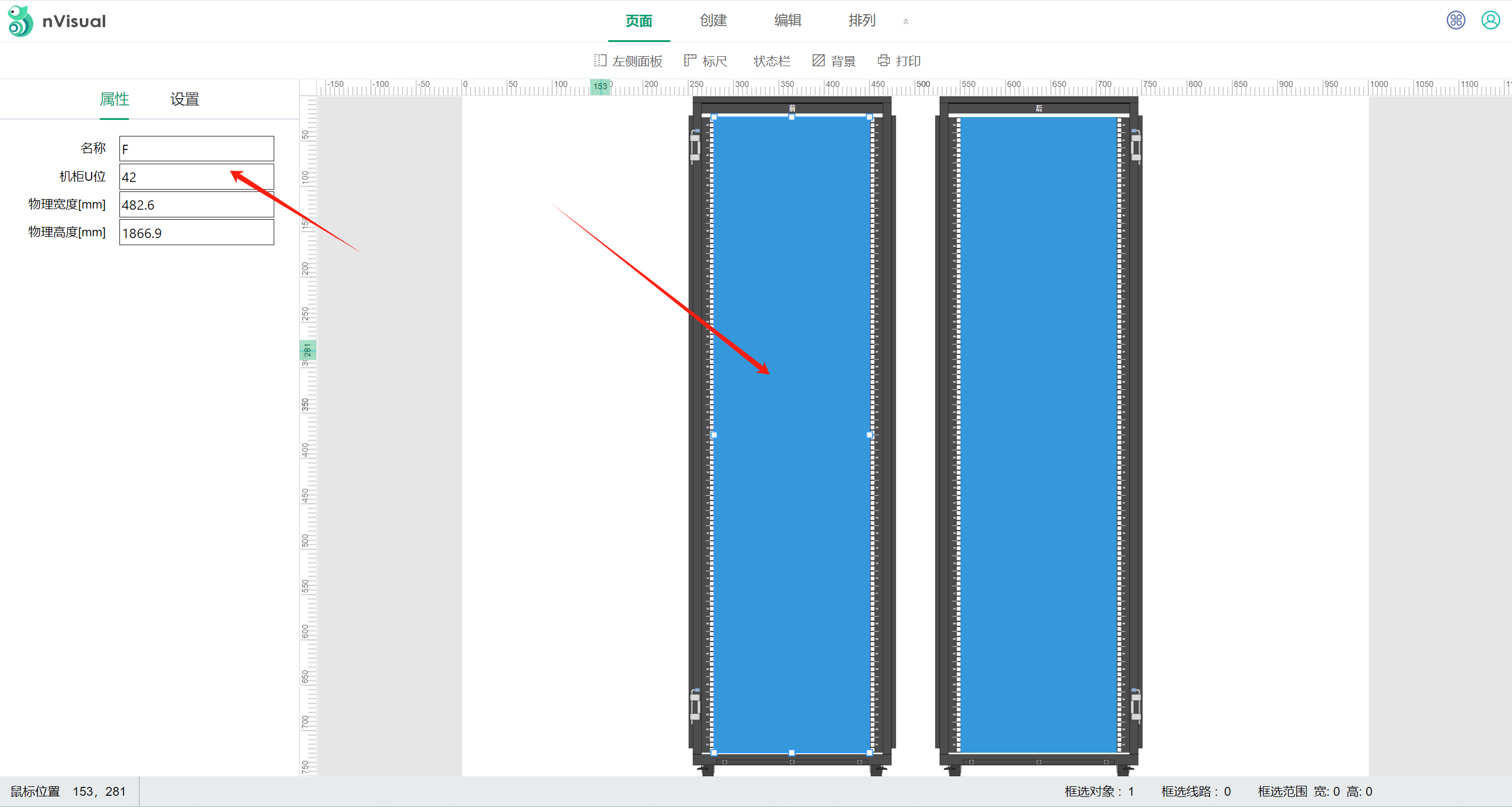2、进入机柜建模视图后,选中机柜容器,左侧属性-机柜U位,输入实际机柜U数