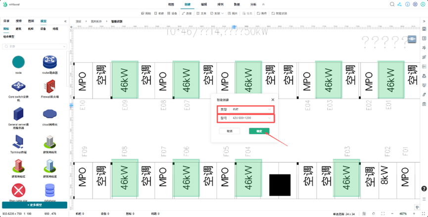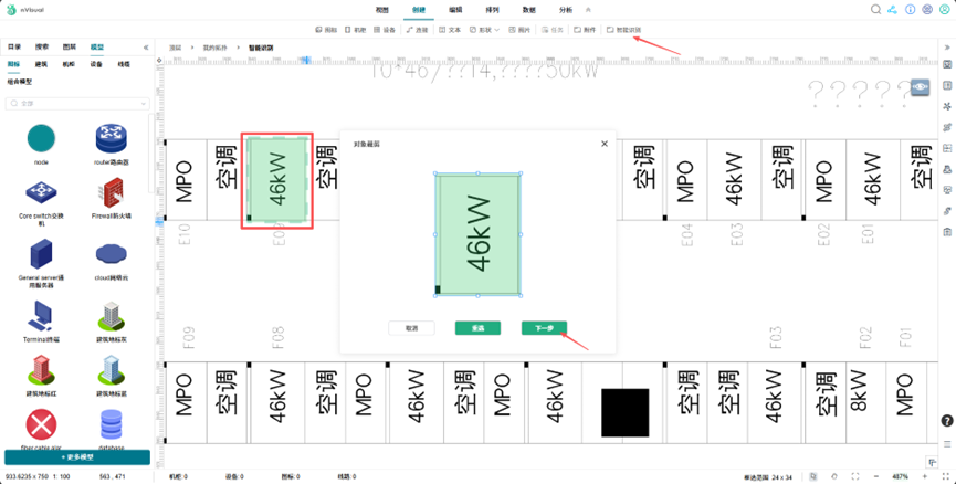 通过“创建”→“智能识别”可在对导入的CAD图纸PNG图片上自动识别图纸中的对象,如:机柜、柱子、墙体、门窗等。框选一个要识别的对象,自动识别出当前图纸中所有的同类对象,点击下一步,选择要批量创建的对象类型与对象型号,点击确定即可批量创建。