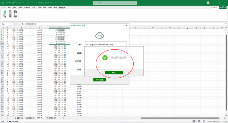 配置Excel插件:单击按钮“nVisual”→“账户设置”→输入“用户名”和“密码”→点击“保存设置”→提示“测试连接成功”→“确定”完成配置。