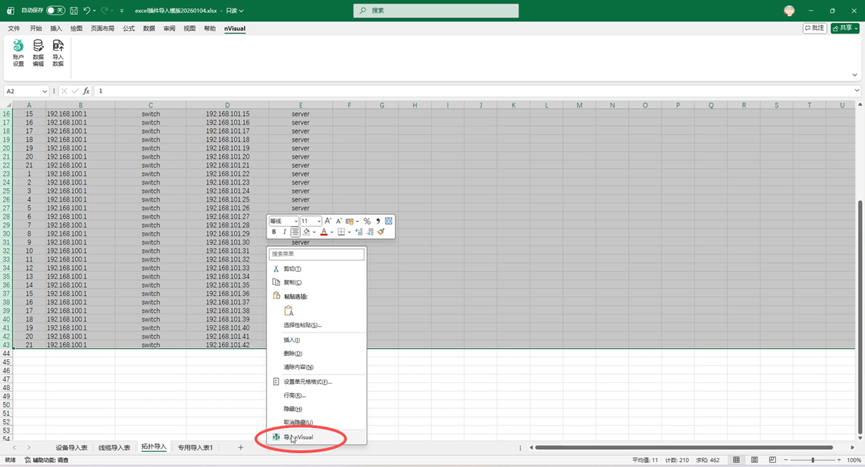 导入Excel数据:选中需要导入的数据单击鼠标右键→“导入nVisual”→完成数据导入。