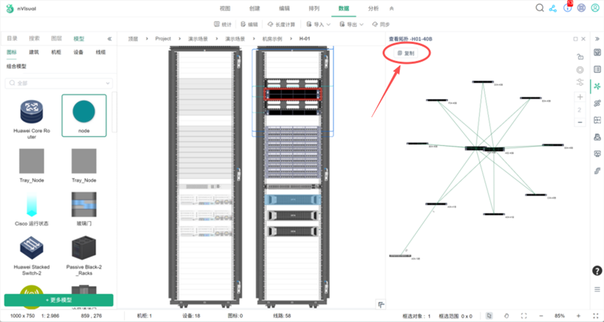 注:对象的型号支持通过下拉列表更换,但机柜需要具有相同的U位,设备需要具有相同的插槽与端口才可以替换。