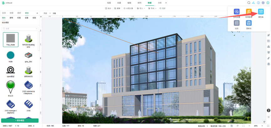 当进入一个空白视图或通过 视图-场景 打开时,会出现模版库选项,点击进入显示当前可用模版列表,选择模版可导入到当前视图。也可以导入已有场景的NVL文件用做当前视图的模版。项目应用中可将常用的模版放到模版库,在创建项目时可直接引用,提高规划设计效率。