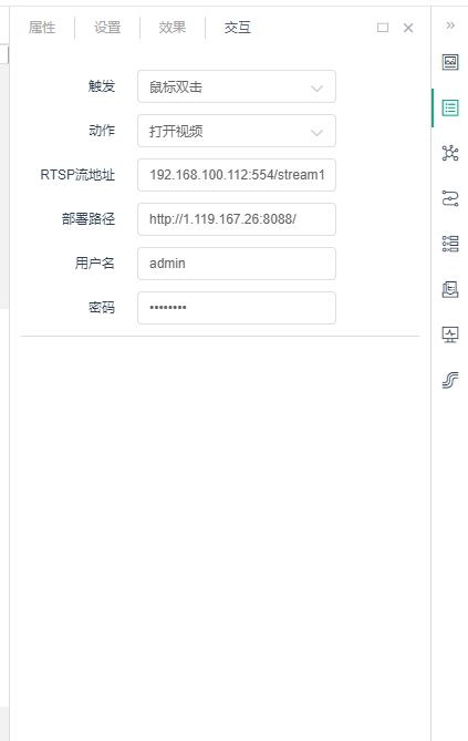 3、接下来需要设置视频的相关信息,首先是RTSP流地址,该地址是监控部署服务器的地址,这里不需要加http或者https,单纯的服务器地址加视频的访问路径即可,因为该路径需要拼接用户名和密码,完整的地址应该是如下所示“rrtsp://admin:Admin123@192.168.100.112:554/stream1”,这里只需要输入“192.168.100.112:554/stream1”。其次是部署的路径,获取到上一个地址后需要通过那个地址去请求真正的视频地址,部署地址就相当于一个请求的接口路径,所以是需要输入http或者https的,相当于一个正常的服务器请求路径,如下所示:“http://1.119.167.26:8088/”,其次就是用户名和密码,就是正常的服务器登录用户名密码,用于拼接到RTSP流地址上。如下所示