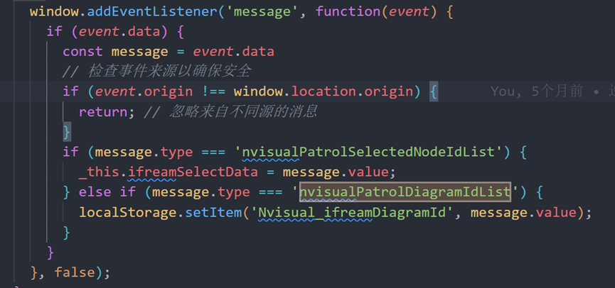 Iframe嵌入nVisual,在iframe渲染完成之后,以后通过增加window.addEventListener()方法监听message事件,来获取nvisual当前的所在层级以及所选中的节点列表以及线缆列表。