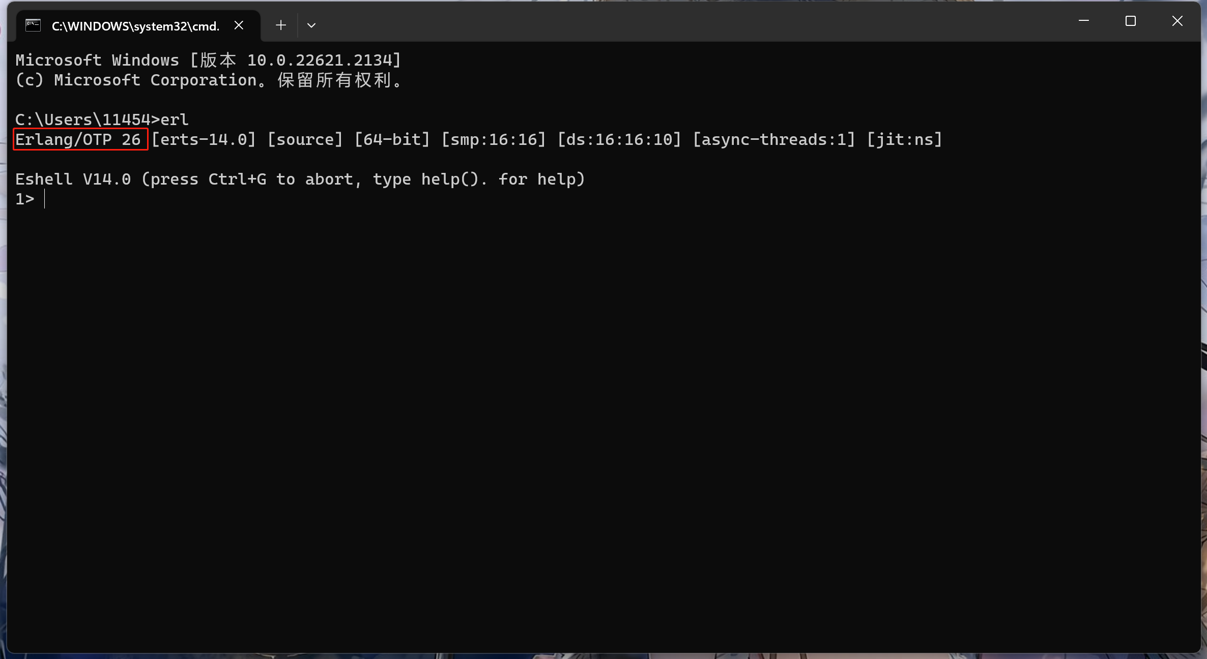 打开cmd窗口,输入erl,点击enter,出现erlang版本号,就说明安装成功。