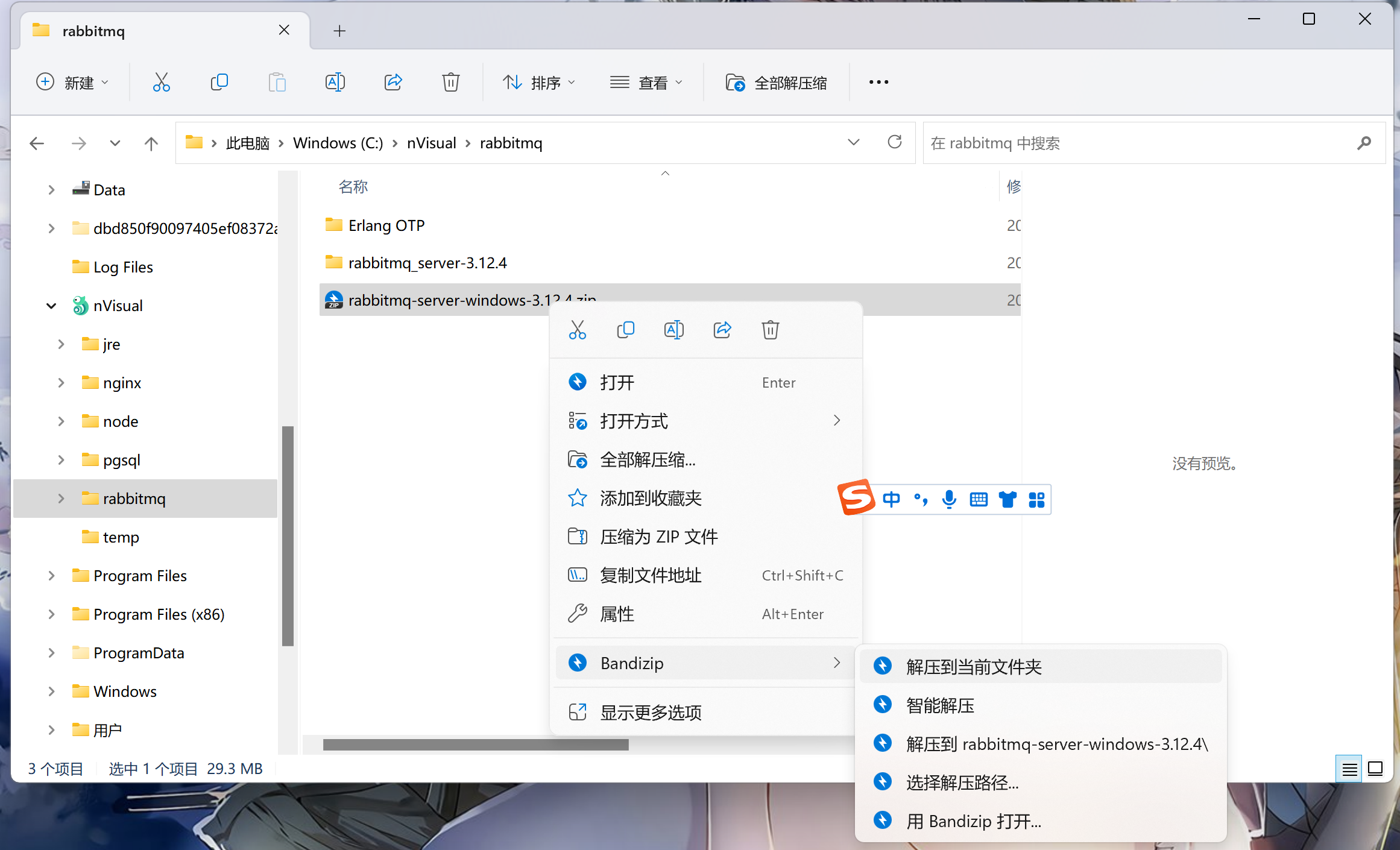 把压缩包解压至当前文件夹 解压后文件夹名称为“rabbitmq_server-3.12.4”,不可存在多级目录。