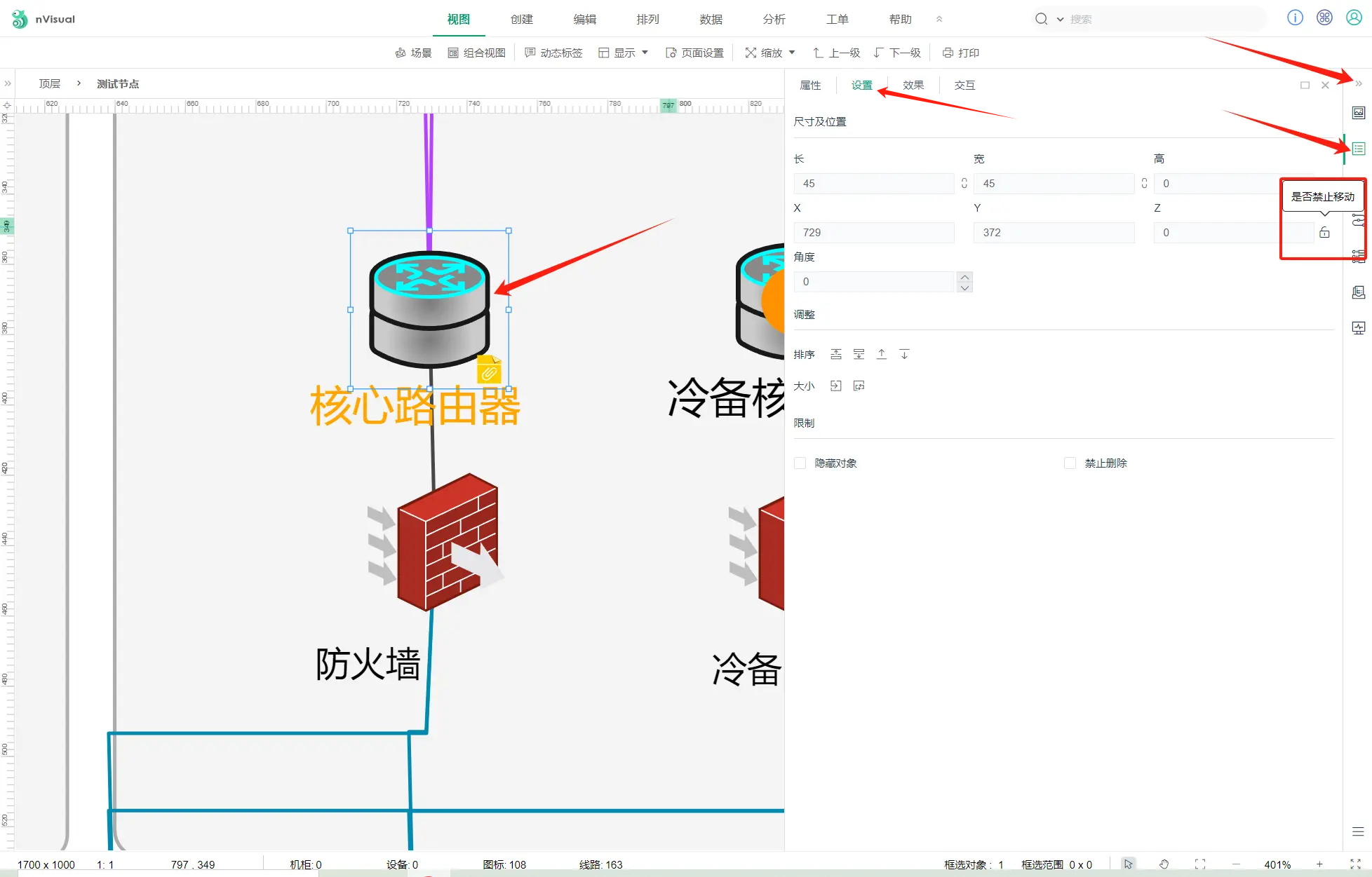 单击选中对象 → 属性 → 设置,将X、Y、Z后面对应锁形按钮可控制对象是否可移动。