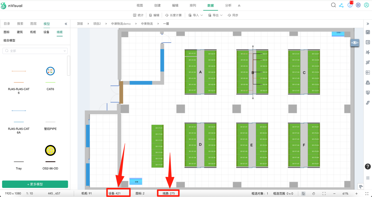 上架完成需验证拓扑内的设备与线缆数量,是否与在机房内操作上架设备与线缆数量一致。可通过页面下方的数量进行快速核对。