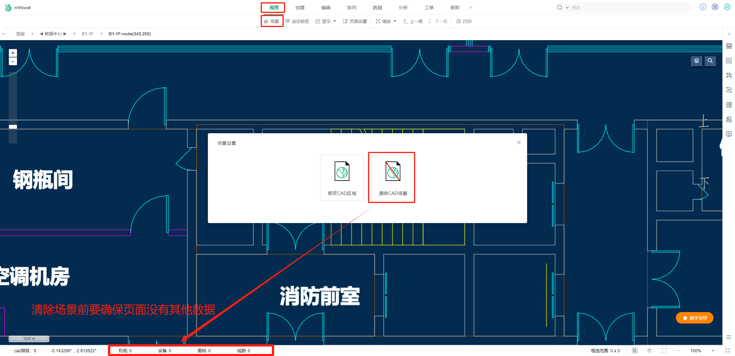 注:清除前要将页面添加的对象全部删除,确认视图底部机柜、图标、设备、线路对应的数字是0。
