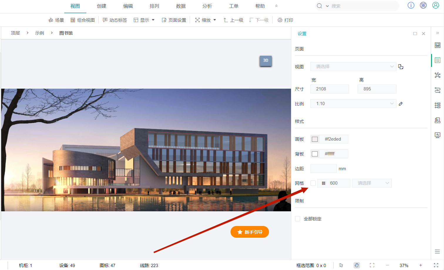 点击右侧详细视图,打开属性设置,即可设置网格。